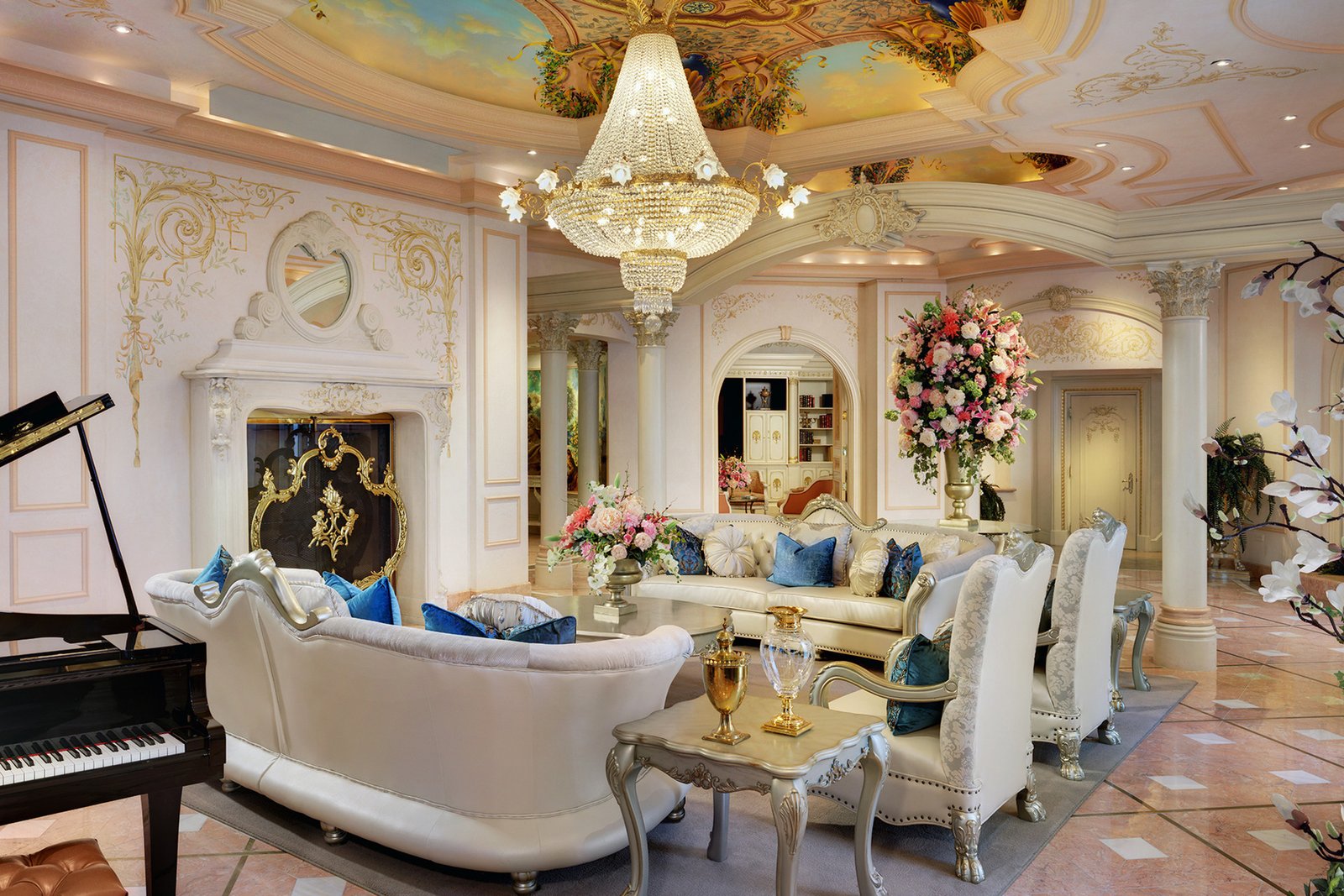 At 13,200 square feet, the Imperial Sky Villa is one of the largest and most thoughtfully arranged suites in the world. Designed to sleep up to 10 guests (and entertain many, many more), it blends the proportions of a private estate with the amenities and services of a full-scale resort. The villa includes three king bedrooms, two double bedrooms, multiple spa-style bathrooms, generous living and dining spaces, and a private pool terrace that extends the interior outward. Every room is designed to be as opulent and accommodating as possible. Blackout curtains, refined climate controls, considered lighting, and custom furnishings support an environment centered on privacy, comfort, and ease. Polished stone surfaces and understated architectural lines contribute to the over-the-top aesthetic.